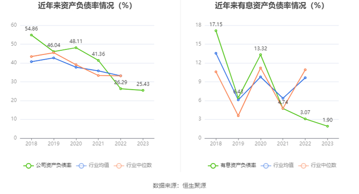 在偿债能力方面,公司2023年年末资产负债率为25.43%,相比上年末下降0.86个百分点;有息资产负债率为1.90%,相比上年末下降1.17个百分点。