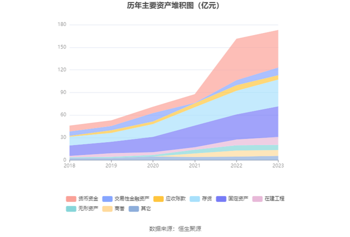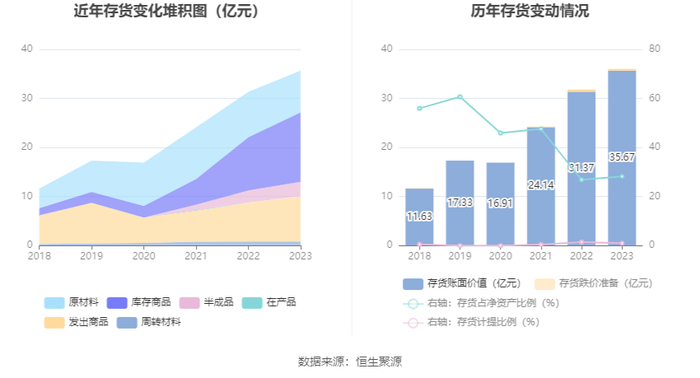 从存货变动来看,截至2023年年末,公司存货账面价值为35.67亿元,占净资产的28.24%,较上年末增加4.3亿元。其中,存货跌价准备为3540.96万元,计提比例为0.98%。