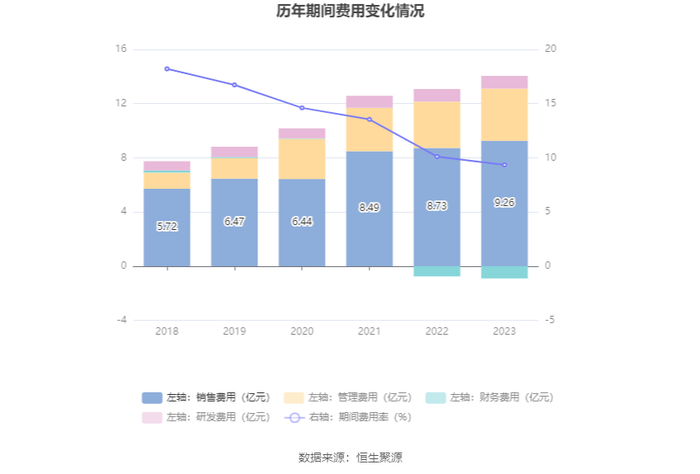 2023年,公司期间费用为13.15亿元,较上年同期增加8193.18万元;但期间费用率为9.36%,较上年同期下降0.76个百分点。其中,销售费用同比增长6.04%,管理费用同比增长12.6%,研发费用同比增长1.22%,财务费用由去年同期的-7541.94万元变为-9044.59万元。