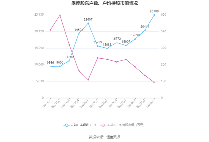 筹码集中度方面,截至2023年年末,公司股东总户数为2.51万户,较三季度末增长了4664户,增幅22.81%;户均持股市值由三季度末的177.89万元下降至122.20万元,降幅为31.31%。