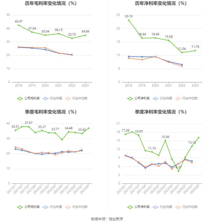 2023年,公司毛利率为34.99%,同比上升2.29个百分点;净利率为11.76%,较上年同期上升0.72个百分点。从单季度指标来看,2023年第四季度公司毛利率为36.98%,同比上升7.65个百分点,环比上升3.56个百分点;净利率为16.13%,较上年同期上升7.59个百分点,较上一季度上升3.01个百分点。