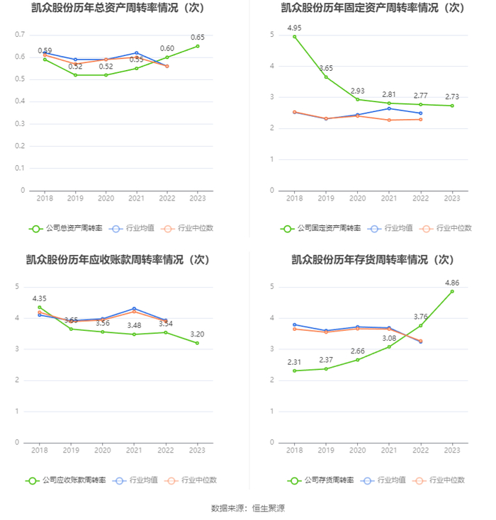 营运能力方面,2023年,公司公司总资产周转率为0.65次,上年同期为0.60次(2022年行业平均值为0.56次,公司位居同行业43/98);固定资产周转率为2.73次,上年同期为2.77次(2022年行业平均值为2.49次,公司位居同行业40/98);公司应收账款周转率、存货周转率分别为3.20次、4.86次。