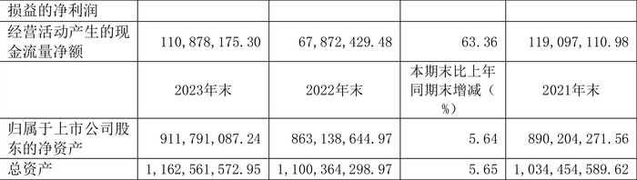 2023年,公司经营活动现金流净额为1.11亿元,同比增长63.36%;筹资活动现金流净额-1848.52万元,同比增加3477.36万元;投资活动现金流净额-9283.72万元,上年同期为-1.16亿元。