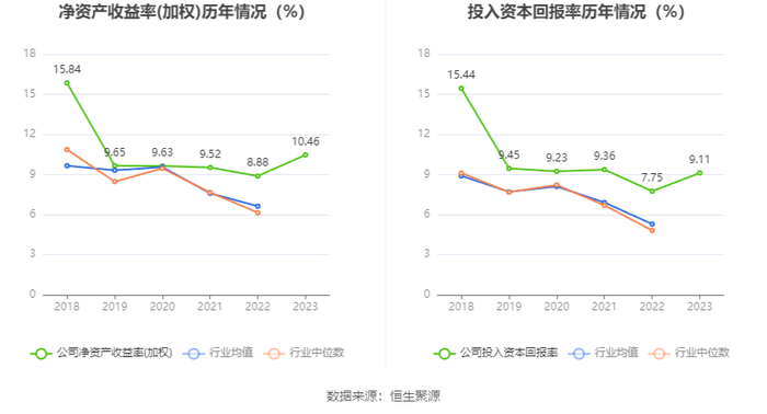 数据显示,2023年公司加权平均净资产收益率为10.46%,较上年同期增长1.58个百分点;公司2023年投入资本回报率为9.11%,较上年同期增长1.36个百分点。