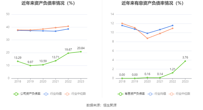 在偿债能力方面,公司2023年年末资产负债率为20.84%,相比上年末上升1.17个百分点;有息资产负债率为3.76%,相比上年末上升2.55个百分点。
