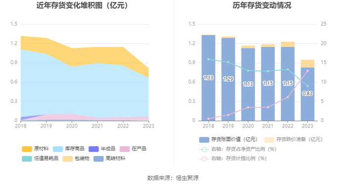 从存货变动来看,截至2023年年末,公司存货账面价值为8263.69万元,占净资产的9.06%,较上年末减少3242.34万元。其中,存货跌价准备为1230.15万元,计提比例为12.96%。