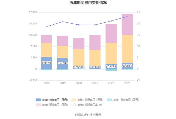 2023年,公司期间费用为1.72亿元,较上年同期增加3522.59万元;期间费用率为23.20%,较上年同期上升1.97个百分点。其中,销售费用同比增长28.97%,管理费用同比增长30.5%,研发费用同比增长11.2%,财务费用由去年同期的-498.57万元变为-122.21万元。
