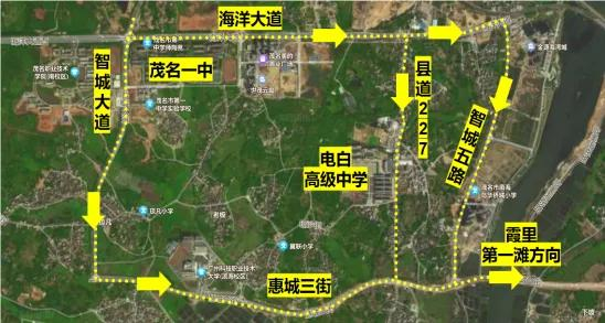 电白区往茂名市区方向的车辆建议可从莱茵大道、潘州大道等道路绕行,茂名市区方向往电白方向建议可从中德大道、潘州大道等区域绕行。
