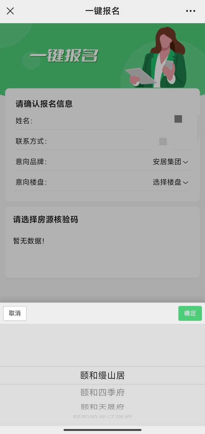 点击“确定”后,记者看到报名页面上有“意向品牌”和“意向楼盘”两个选项,在“意向品牌”中仅有“安居集团”一个选项,选择后,在“意向楼盘”中便出现了13家楼盘可供选择,均为安居集团旗下楼盘,包括颐和缦山居、颐和四季府、颐和天晟府、颐和铂岸江璟府、汤山颐和府、汤山玉兰公馆等。