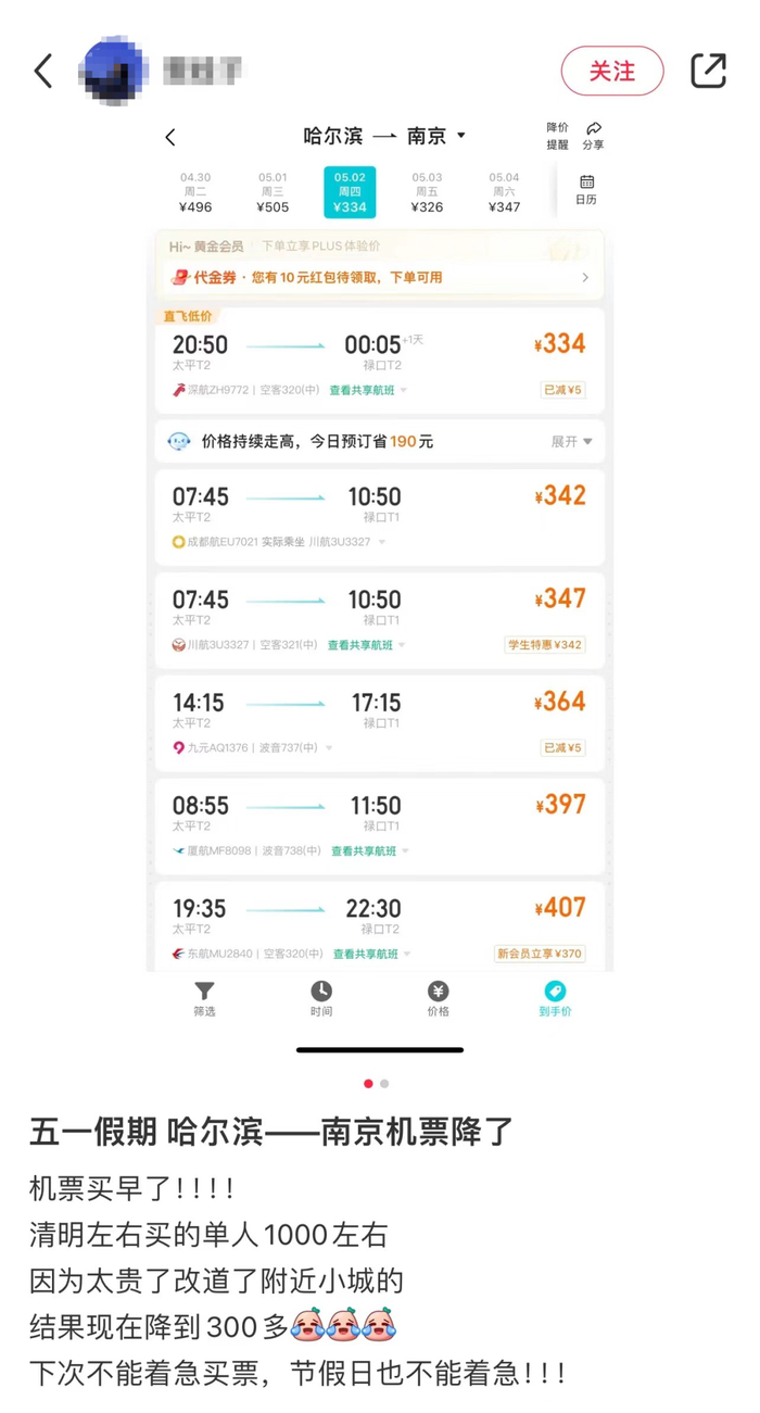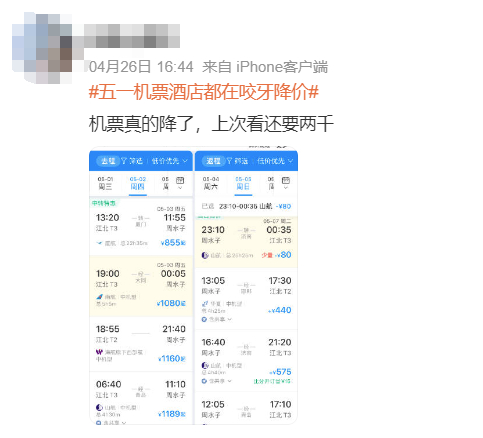 与此同时,近7天“五一”假期境内经济舱机票均价852元(不含税),同比去年下跌1.13%,环比此前7天搜索时的均价下跌22%——机票价格临时跳水。