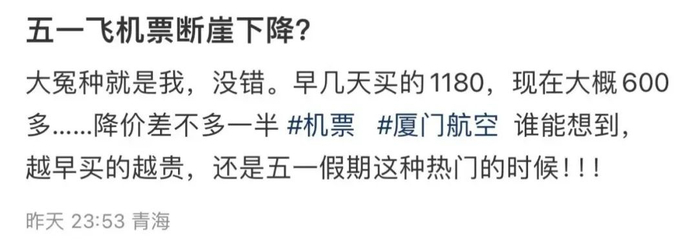 根据4月26日下午航班数据服务公司飞常准发布的数据,对于中国民航来说,今年“五一”假期将是史上最忙。然而,有些“违背常理”的是,最忙之下,“五一”假期机票临时降价,让提前购票的消费者大呼吃亏,那么这是怎么回事?