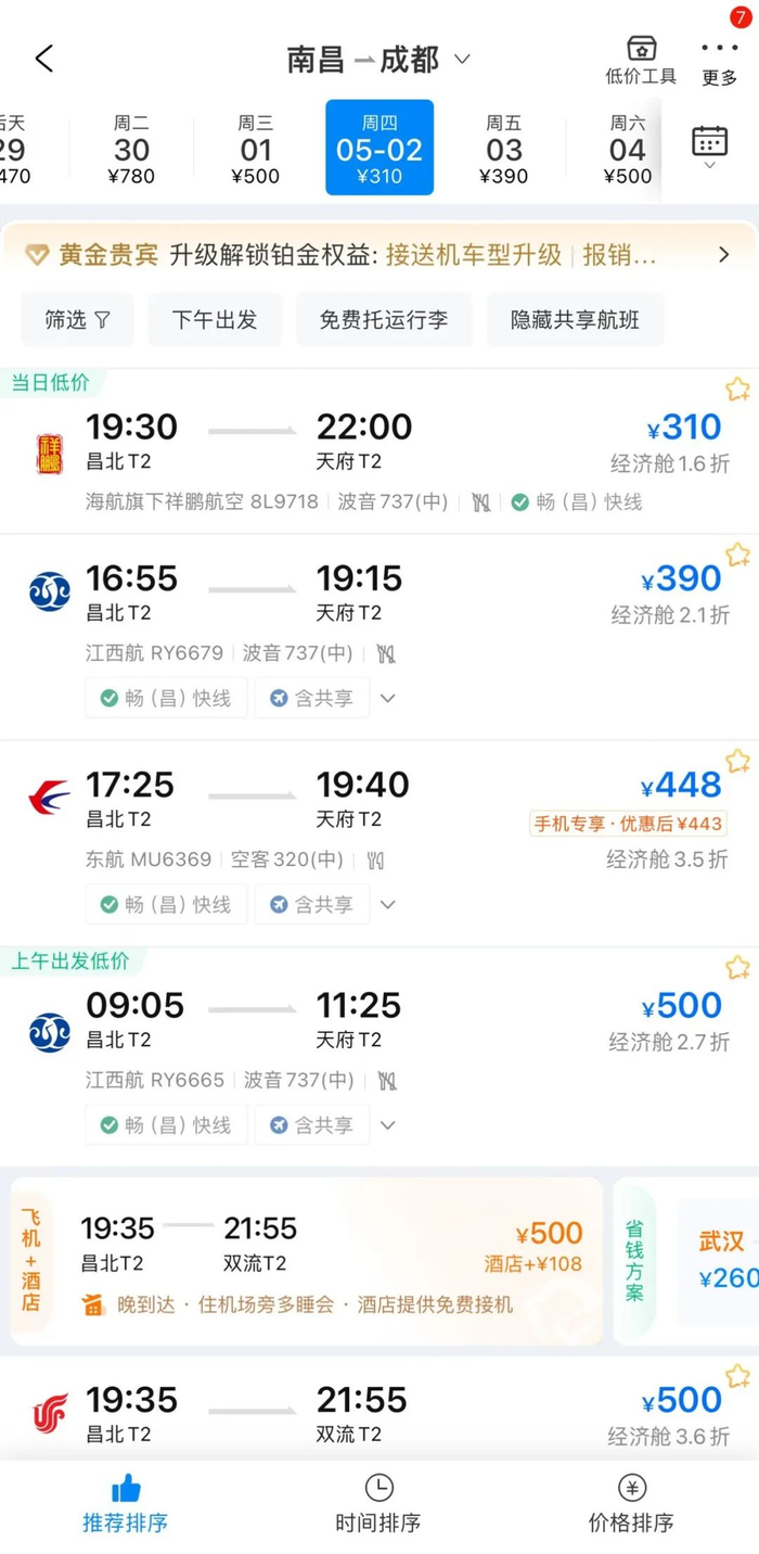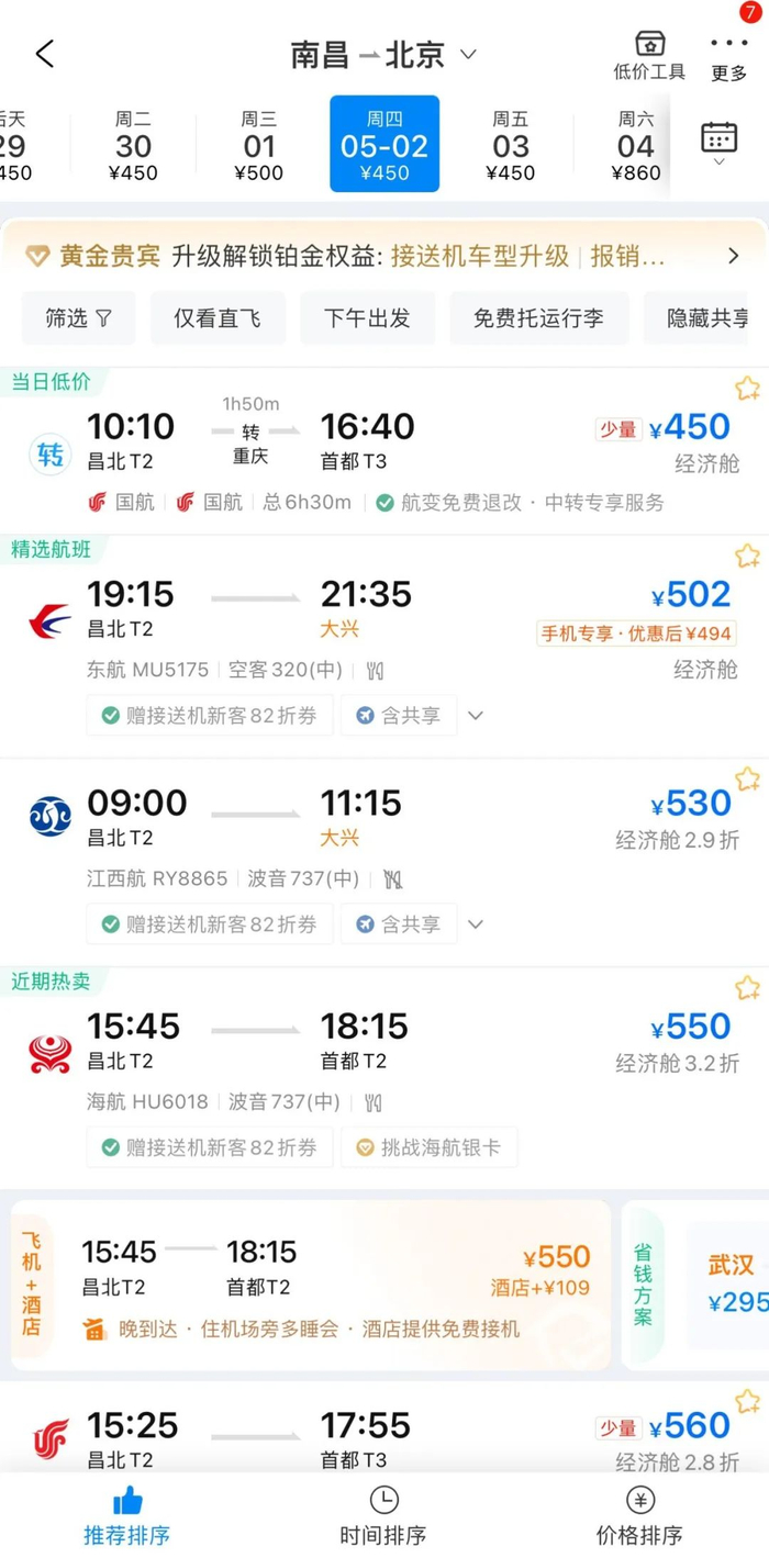都市现场记者查询发现,5月2日,南昌飞往北京票价502元起,南昌飞往成票价310元起。