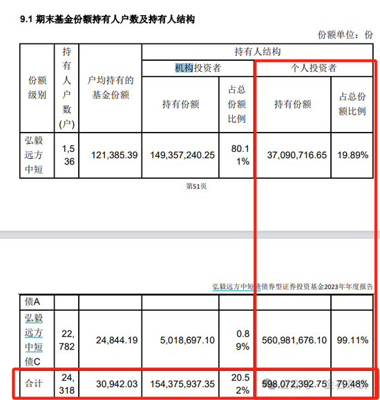 大家看,截至2023年年报,弘毅远方中短债机构持仓1.54亿份,而散户持仓占比近80%,高达5.98亿。可以预测,随着弘毅远方中短债暴跌前收益稳步抬升,很多基民会蜂拥而入。