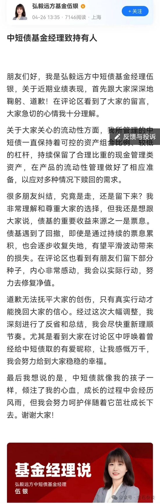 对于弘毅远方中短债突然闪崩,美女基金经理紧急致歉:1)关于流动性,该产品一直保持着可控的资产组合比例和较低的杠杆,持续保留了合理比重的现金管理类资产以应对多种情况下的赎回需求。