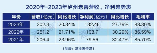 酒业家根据年报数据统计得出,2021年-2023年的三年间,泸州老窖每年都保持了营收20%以上、净利润25%以上的增长,三年营收累计增长95.9亿元、增幅46.46%,净利润累计增长52.9亿元、增幅66.49%。