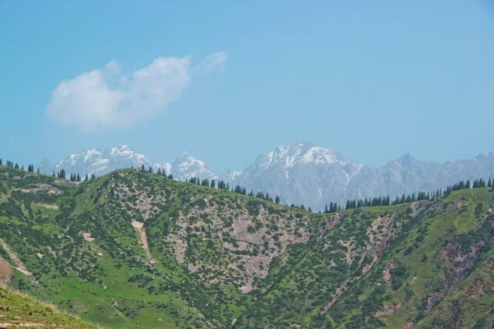 托木尔峰的积雪夏天融化后,水流成河,形成了一个天然水库,灌溉着这里的核桃树。