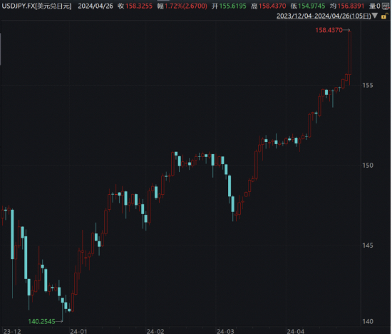 过去24小时,美元兑日元连续跌破156、157和158的整数关口。国际投资者正大举押注日元贬值,而日本政府何时出手干预汇率值得关注。