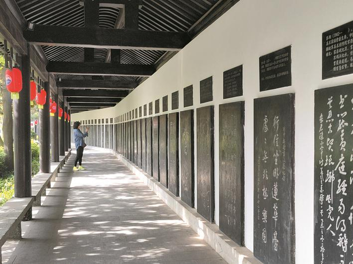 走进王羲之故居,有亭台楼阁,有承载着历史故事的鹅池,有巨大的《兰亭集序》碑,有在长廊间整齐排列的书法名家作品,还有书法爱好者在廊下独自练习。