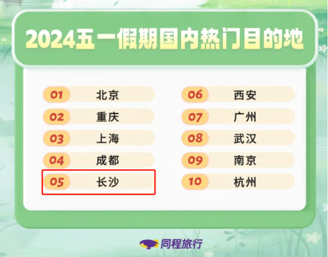 12日,同程旅行发布的《2024“五一”假期旅行趋势报告》(以下简称《报告》)显示,在五一假期旅游热度最高的目的地城市榜单中,长沙位居全国第五。其中亲子游、文化游、美食游等深度体验玩法,是年轻游客开启假期旅行的新“姿势”。