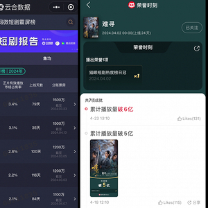 《难寻》,前段时间芒果TV&湖南卫视力推短剧,累计播放量破了6亿、抖音话题播放量破了4.86亿(猫眼专业版数据),此前解锁的12元直通大结局观剧礼备受关注;