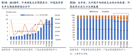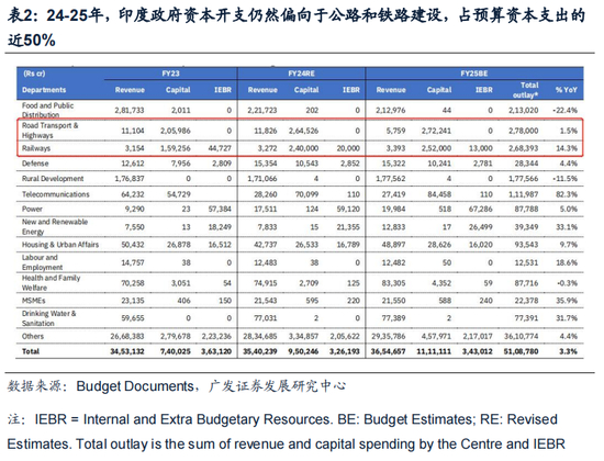 24-25年,中央财政支出预算显示,印度政府资本开支增速将维持高位水平,结构上偏向于公路和铁路建设,占预算资本支出的近50%。我们预计财政大力支持的公路、铁路等传统基建部门将继续保持较高的增长水平。
