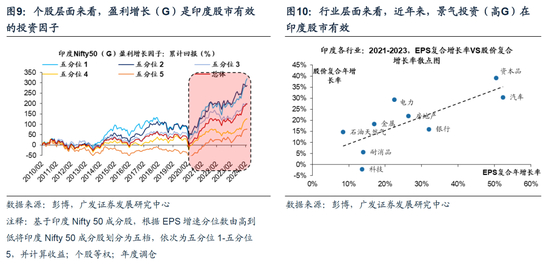 全球疫情、俄乌冲突以来,“确定性”的盈利增长前景成为印度股市的核心驱动,盈利增长(G)无论对于印度股市的行业比较还是个股投资而言均是有效的。个股层面来看,盈利增长因子(G)分位数靠前的个股录得更高的累计的回报;行业层面来看,近年来,印度股市各行业的盈利复合年增长率和股价复合年增长率具有显著正相关性。