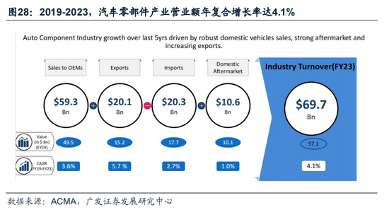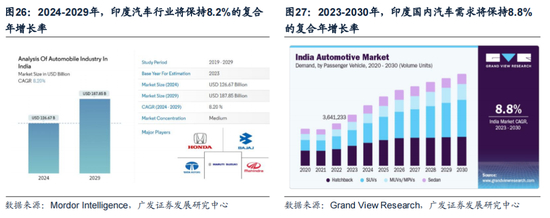 内外需双轮支撑汽车需求端韧性:一方面,伴随着印度城镇化进程的持续推近+印度制造业逐步崛起+人口红利释放,印度人均收入水平有持续抬升的驱动力,将带动印度国内对汽车需求的增长。据Grand View Research预测,2023-2030年,印度国内汽车需求将保持8.8%的复合年增长率。另一方面,近年来,印度凭借年轻&廉价的劳动力优势已经逐渐打开汽车海外出口市场。新投资范式,逆全球化趋势进一步强化,友岸外包战略下,印度对欧美的汽车出口有望维持高增长水平。