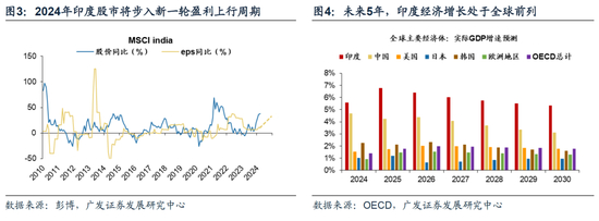 1.企业盈利成为主要驱动力。(1)短期而言,彭博一致预测数据显示,2024年MSCI印度指数将步入新一轮盈利上行周期,盈利扩张大概率将拉动印度股市持续上涨。(2)中长期而言,据OECD预测,未来5年印度GDP增速在6%的中枢以上,处于全球经济体增长前列。我们在24.4.12《新投资范式:大变局下全球股市如何配置?——“债务周期大局观”系列(七)》提示,新投资范式将驱动全球DDM分子端分层,受益于人口&债务周期位置占优+逆全球化全球产业链重塑→以印度为代表的泛东南亚经济体中具有确定性增长前景。