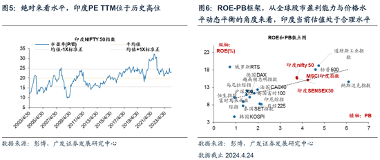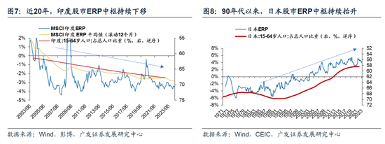 新范式下,印度强劲的增长预期+大国博弈下具有潜在的正面外溢效应+(莫迪有望连任)政治保持连续性的前景—>相对估值中枢抬升。我们在24.4.12《新投资范式:大变局下全球股市如何配置?》提示,参照90年代日本的经验,诸如人口结构老龄化等趋势性的结构因素将导致日本经济中长期增长预期的恶化—>压低股市风险偏好—>推动风险溢价中枢上移。那么以此反推印度,人口结构年轻化等积极的结构性趋势将改善印度经济中长期增长预期—>提振股市风险偏好—>推动风险溢价中枢下移。