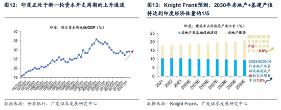 2024年,房地产和基础设施将成为印度经济的主要增长动力。中长期来看,印度正处于新一轮资本开支周期的上升通道。据Knight Frank预测,到2030年,房地产+基建产值将达到印度经济体量的1/5;2024-2030年,预计房地产服务业产值将维持8.8%的复合年增长率,房地产及基础设施建设业产值将维持1.9%的复合年增长率。