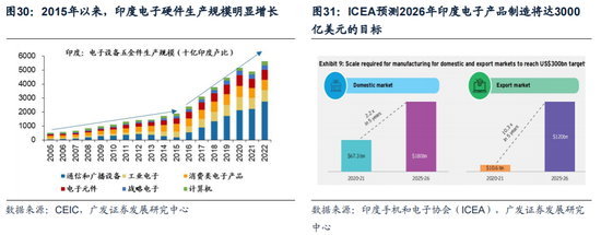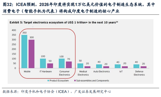 据印度手机和电子协会(ICEA)预测:2026年印度电子产品制造产值将达3000亿美元的目标,有望实现“强化内需供应弹性+拓展外需市场空间”的双重目标,消费电子(智能手机为代表)将构成印度电子制造核心产业。ICEA预测:2026年印度将实现1万亿美元价值的电子制造生态系统,其中消费电子链(智能手机为代表)将进一步形成规模效应,成为印度电子制造生态规模最大的核心产业。