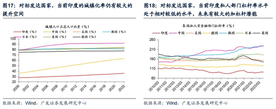 中长期来看,城镇化较低+私人部门杠杆率水平较低—>印度房地产+地产销售链条仍有较大的发展空间。一方面,Wind数据显示,截止22年,印度城镇化率仅达35.9%,人口增长和经济发展将不断推动印度城镇化的进程,大规模城市化人口转移将大幅增加对房地产的潜在需求。另一方面,当前印度私人部门杠杆率水平远低于主流发达经济体,居民仍有较大的加杠杆空间。