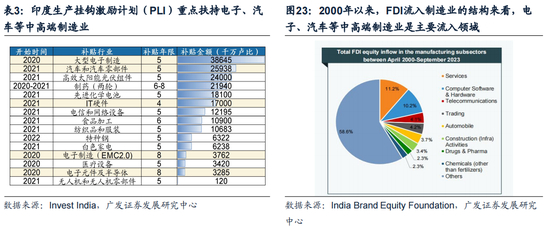 (2)逆全球化产业链重塑—>外需韧性。近年来,电子&汽车为代表的中高端&高附加值制造业实现了出口额快速增长,同时也是外资FDI的主要流入领域。近年来,脱钩重塑全球产业链格局,印度凭借年轻&廉价的劳动力优势,有望成为下一个制造业大国。从印度20-22年的出口结构来看,出口增速TOP20的产业大部分仍局限于低附加值产业,但电子&汽车为代表的中高端&高附加值制造业实现了出口额快速增长,支撑外需韧性。此外,FDI流入印度制造业的结构来看,电子&汽车等政府战略性支持的中高端&高附加值制造业是主要流入领域。外资建厂有助于带动印度本地产业形成规模效应,进一步带动本地尖端高附加值制造环节发展。