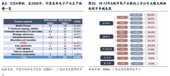 关注印度消费电子零部件(结构件)及组装的投资机会。近年来,印度开始向智能手机产业链上游探索,尝试生产PCBA、连接器等组件。向后展望,凭借较低的用工成本+人口红利+印度持续上调手机特定元件关税,我们判断相应的手机零部件厂商将持续向印度转移产能,进一步带动印度本地高附加值零部件制造环节发展。据印度手机和电子协会(ICEA)预测,至2026年印度对于智能手机组件的生产能力将显著提升,以PCBA为例,2021-2026复合年增长率将达到88.82%。