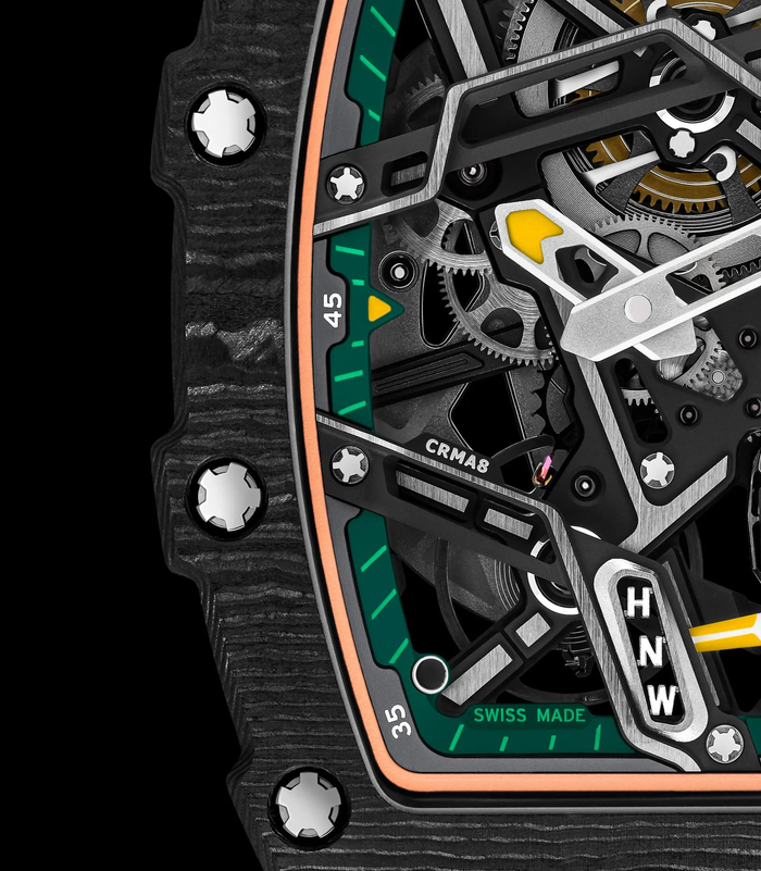 这款腕表搭载了理查米尔自主研发的CRMA8镂空自动机芯,该机芯研发前后耗时三年。整枚机芯结构小巧紧凑,在确保可以承受5000克加速度冲击的同时,让表壳与机芯完美融合,镂空设计令腕表的内部运转一览无余。
