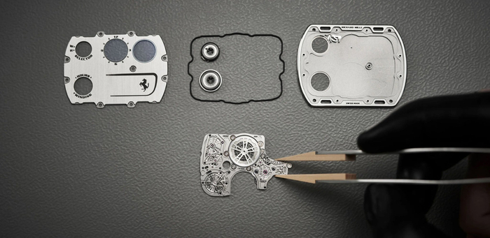 为了解决这一短板,理查米尔与法拉利团队决定把机芯组装在表壳内,开发出了一种配备有钛合金摆轮的全新擒纵结构,在保证安全性上与传统瑞士锚式擒纵结构相同的情况下,极大地减小了机芯厚度。这一超薄擒纵结构也申请获得了专利。