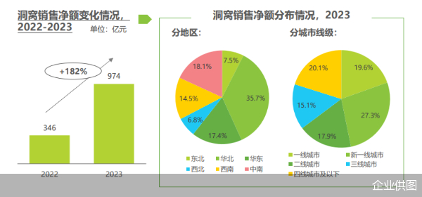 洞窝于2021年6月正式上线,截止2023年末,其已覆盖了包括重庆、成都、武汉、西安、郑州等190个城市900家卖场,累计注册用户数超2500万人,入驻店铺10万家,。伴随着广泛渗透,洞窝平台发力线上线下场景的融合,销售净额显著增长,由2022年的346亿元增至2023年的974亿元,增幅高达182%。加速发展的背后,体现了居然之家新商业模式在变革中的重塑。