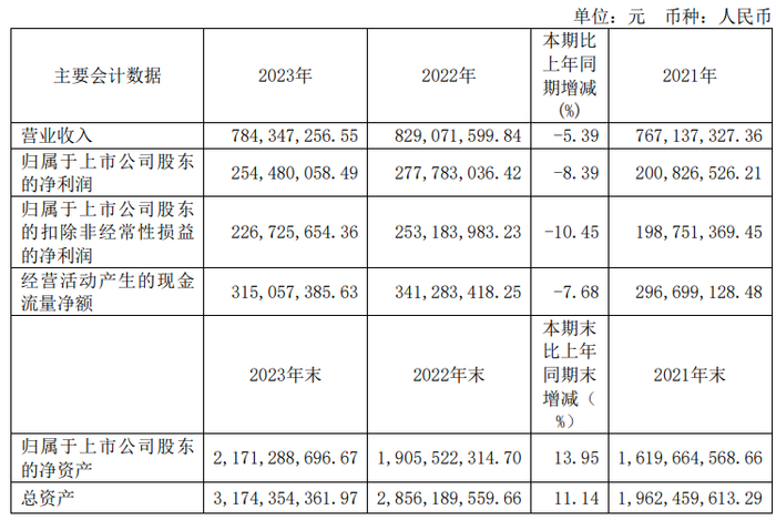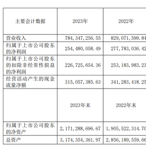 挖贝网4月28日,寿仙谷近日发布2023年年度报告,报告期内公司实现营业收入784,347,256.55元,同比下滑5.39%;归属于上市公司股东的净利润254,480,058.49元,同比下滑8.39%。