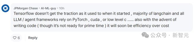 对此,JPMorgan的员工分析表示:「目前大部分LangChain、LLM,以及AI智能体框架,都依赖于PyTorch、CUDA或是更底层的C语言。相比之下,TensorFlow的吸引力已经大不如前。」