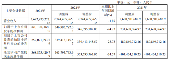 挖贝网4月28日,富佳股份 近日发布2023年年度报告,报告期内公司实现营业收入2,692,975,223.42元,同比下滑1.87%;归属于上市公司股东的净利润261,190,468.35元,同比下滑24.73%。