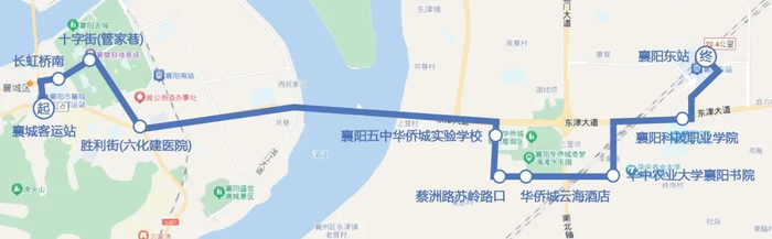 襄城客运站、长虹桥南、十字街(管家巷)、胜利街(六化建医院)、襄阳五中华侨城实验学校、蔡洲路苏岭路蔡洲路口、华侨城云海酒店、华中农业大学襄阳书院、襄阳科技职业学院、襄阳东站。