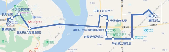 襄阳东站、华中农业大学襄阳书院、华侨城云海酒店、苏岭路蔡洲路口、襄阳五中华侨城实验学校、华侨城纯水岸、东原千江印月、胜利街(六化建医院)、十字街(管家巷)、长虹桥南、襄城客运站。