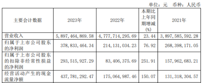 挖贝网4月28日,保隆科技 近日发布2023年年度报告,报告期内公司实现营业收入5,897,464,869.58元,同比增长23.44%;归属于上市公司股东的净利润378,833,464.34元,同比增长76.92%。
