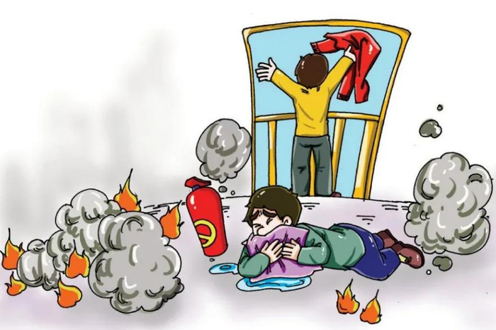 (5)简单防护,捂鼻匍匐。可用毛巾、口罩捂鼻,匍匐撤离。穿过烟火封锁区时,可向头部、身上浇冷水或用湿毛巾、湿棉被、湿毯子等将头和身体裹好,再冲出去。
