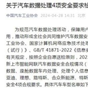 据中国汽车工业协会4月28日通报,为规范汽车数据处理活动,保障用户合法权益,鼓励头部汽车制造商发挥标杆作用,推动形成全社会共同维护汽车数据安全和促进汽车行业发展的良好环境,中国汽车工业协会、国家计算机网络应急技术处理协调中心依据《汽车数据安全管理若干规定(试行)》、GB/T 41871-2022《信息安全技术 汽车数据处理安全要求》等法规标准有关规定,按照企业自愿送检原则。