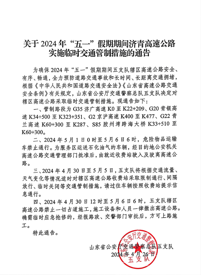 关于2024年“五一”假期期间济青高速公路实施临时交通管制措施的通告