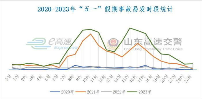 据2020年-2023年“五一”假期事故发生时段统计,上午9至11时,下午15时至16时、17时至18时、晚间19时至20时车流量增加,容易出现刮擦等事故。