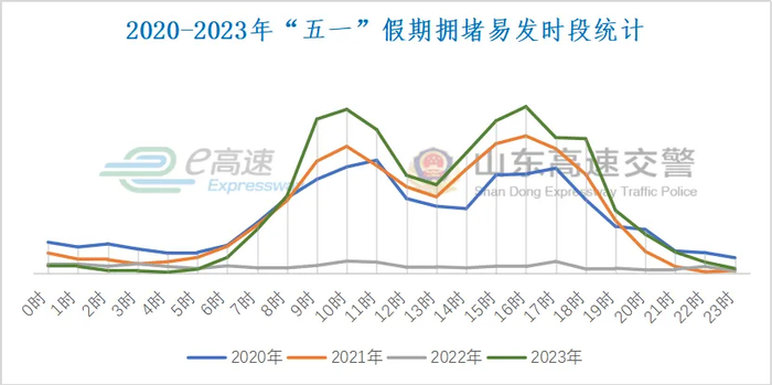 根据2020年-2023年“五一”假期拥堵发生时段统计,拥堵高峰时间为:上午9时至11时和下午15时至18时,建议大家合理规划出行计划,尽量选择非高峰时间出行。