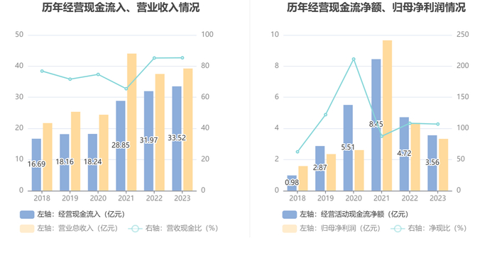 2023年,公司营业收入现金比为85.39%,净现比为106.96%。