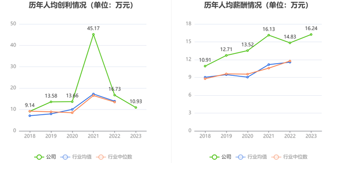 截至2023年末,公司员工总数为3048人,人均创收128.78万元,人均创利10.93万元,人均薪酬16.24万元,较上年同期分别变化-10.51%、-34.67%、9.48%。